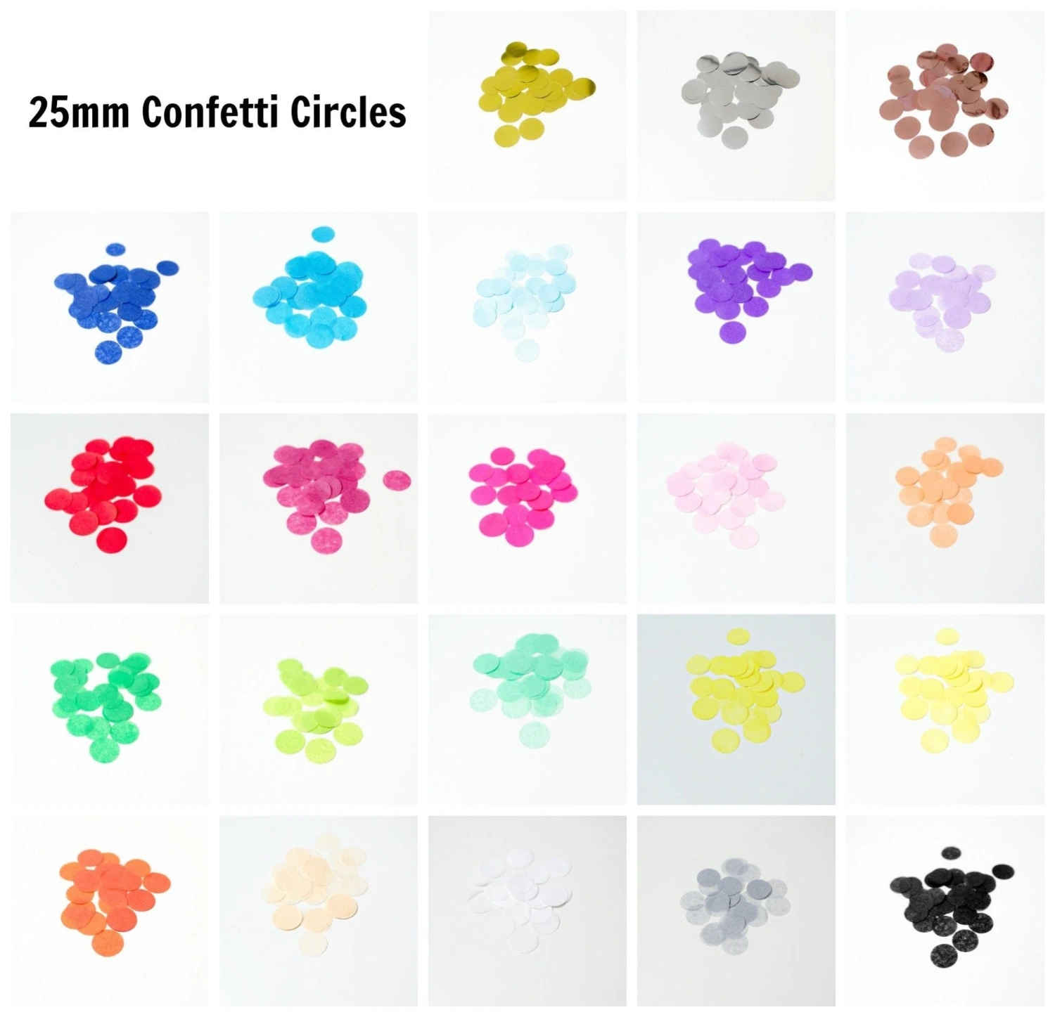 We have a huge range of confetti for you to choose from of tissue (biodegradable) and metallic (non-biodegradable) 25mm confetti circles, choose a mix of up to 8 colours to make truly original confetti balloons. Each gorgeous balloon is filled with a generous handful of your custom confetti mix.