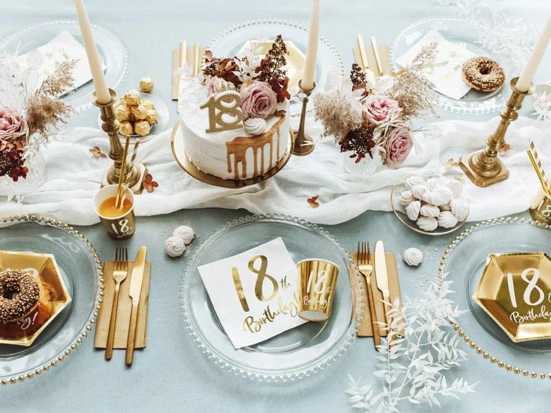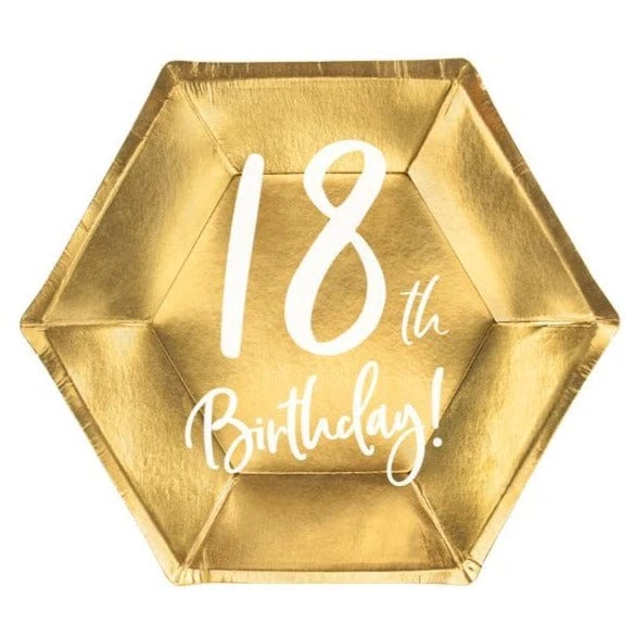 Simple and stylish small gold party plates with white 18th Birthday print.