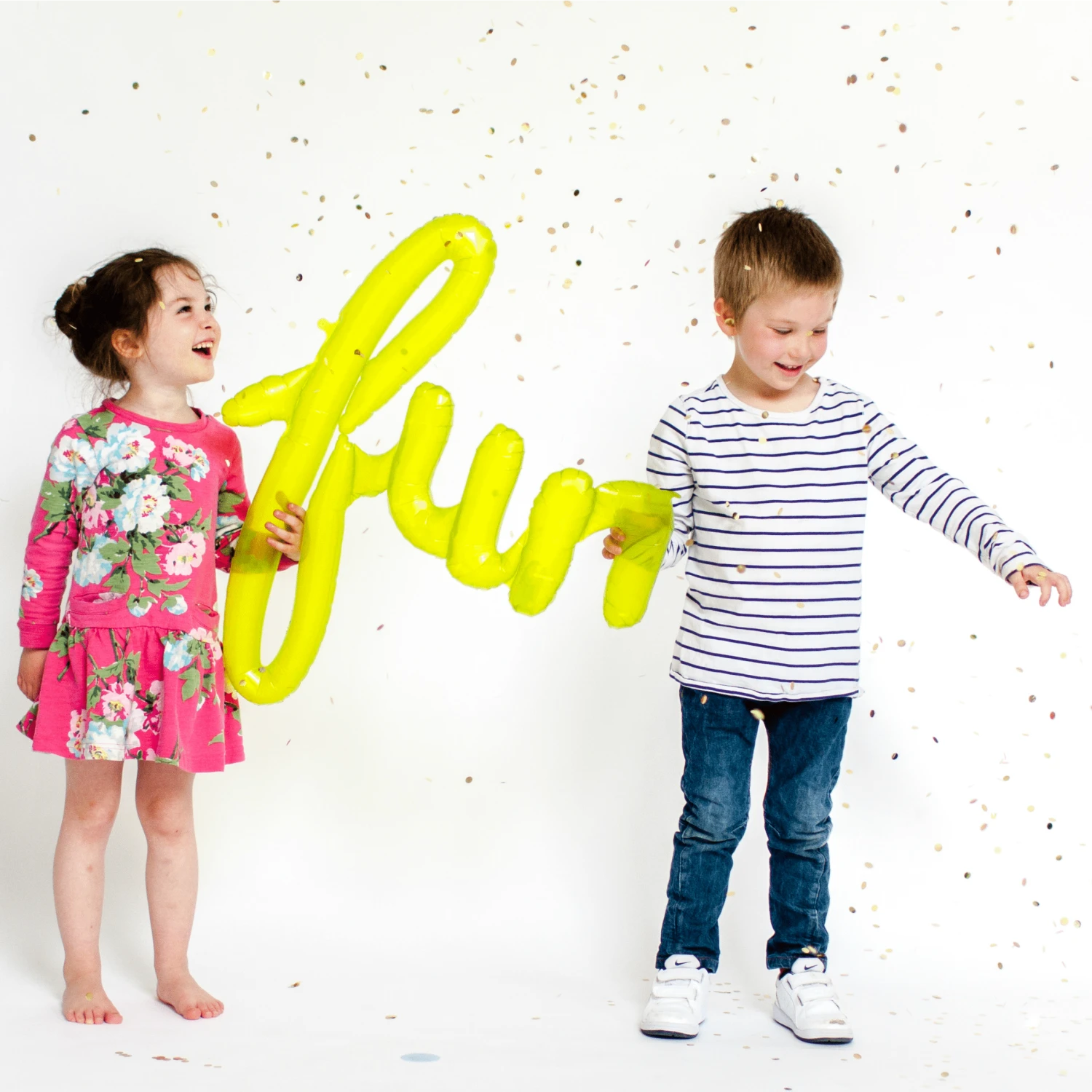 Fun Fun Fun! Balloons don’t get more cheerful than this! This Bright Lime coloured ‘Fun’ script balloon makes us so happy. At 29″ they are a perfect statement piece for large events. It is air-fill only due to its shape, and is designed to be strung up with a nylon line or ribbon to make a banner. It includes a filling straw for easy inflation by mouth.