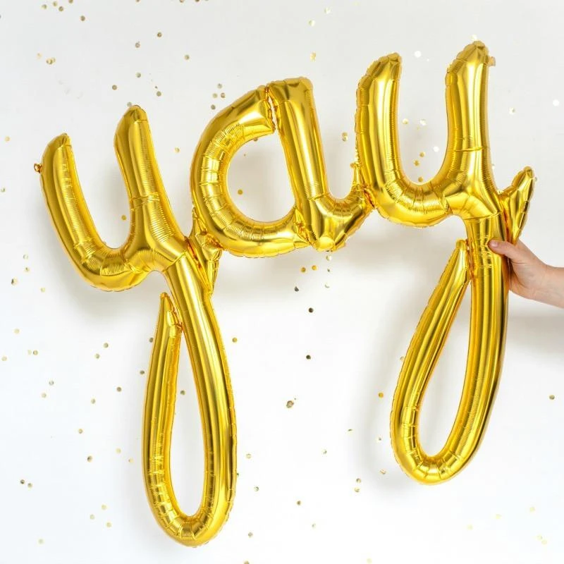 These awesome gold foil ‘yay’ balloons are great for happy occasions. At 33″ they are a perfect statement piece for large events. It is air-fill only due to its shape, and is designed to be strung up with a nylon line or ribbon to make a banner. It includes a filling straw for easy inflation by mouth.