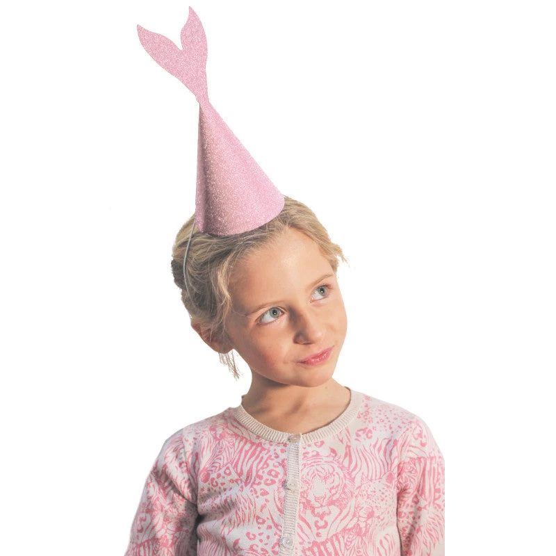 Glittery party hats in the shape of mermaid tails.Â