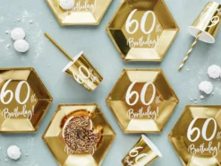 Simple and stylish small gold party plates with white 60th Birthday print.