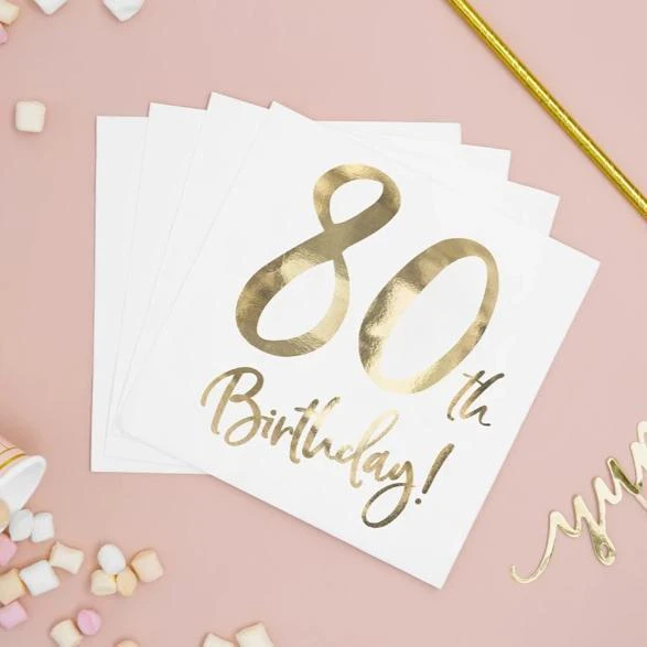 Simple and stylish white party napkins with a gold 80th Birthday print.