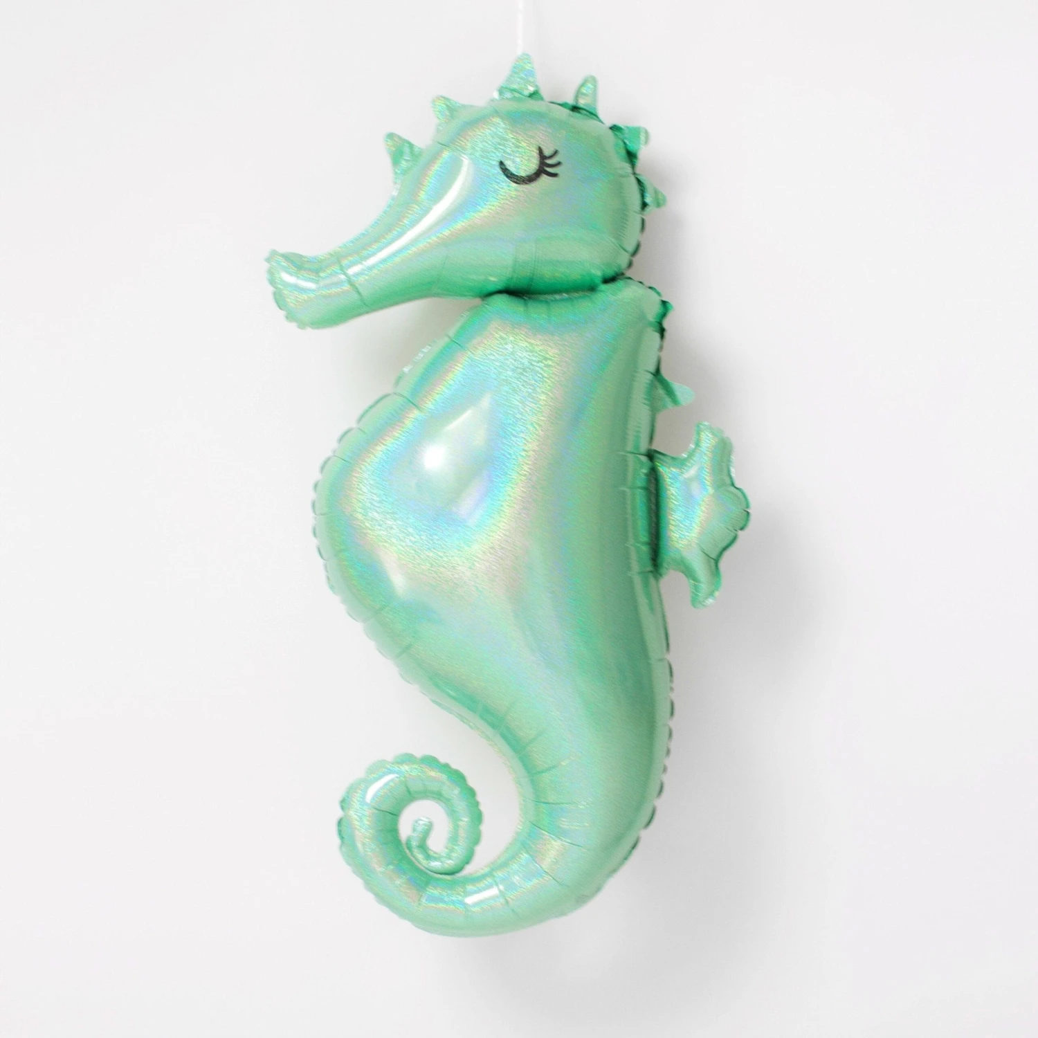 The prettiest seahorse balloon. This huge turquoise seahorse is covered in a holographic sparkle. They make the perfect addition to a mermaid or underwater themed party.