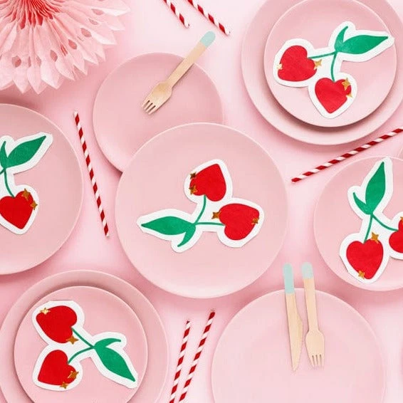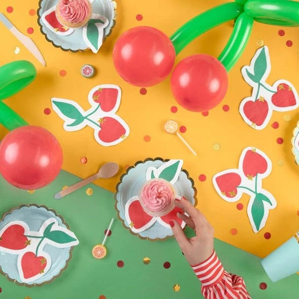 Cute and cheerful cherry napkins. Cut in the shape of cherries with a flourish of gold metallic print.