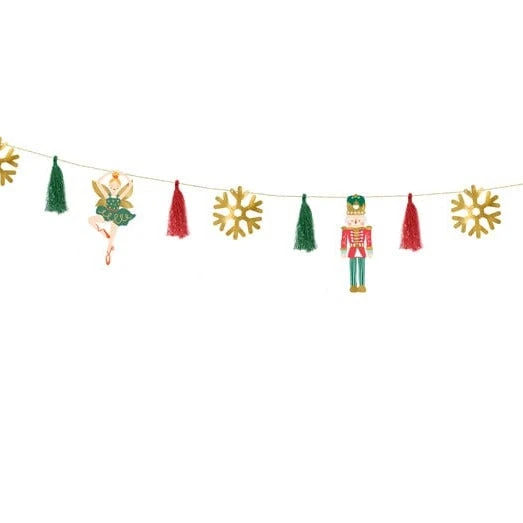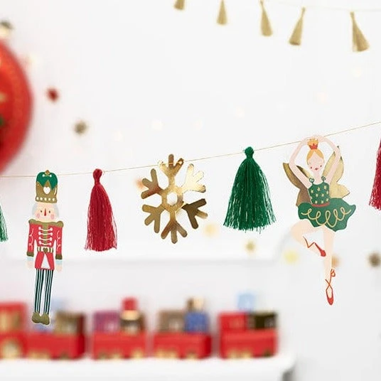 An adorable Christmas tassel garland featuring Nutcrackers, Snowflakes and Fairies. This beautiful garland with golden touches and hanging tassels will add the finishing touch to your Christmas decorations!Â