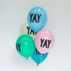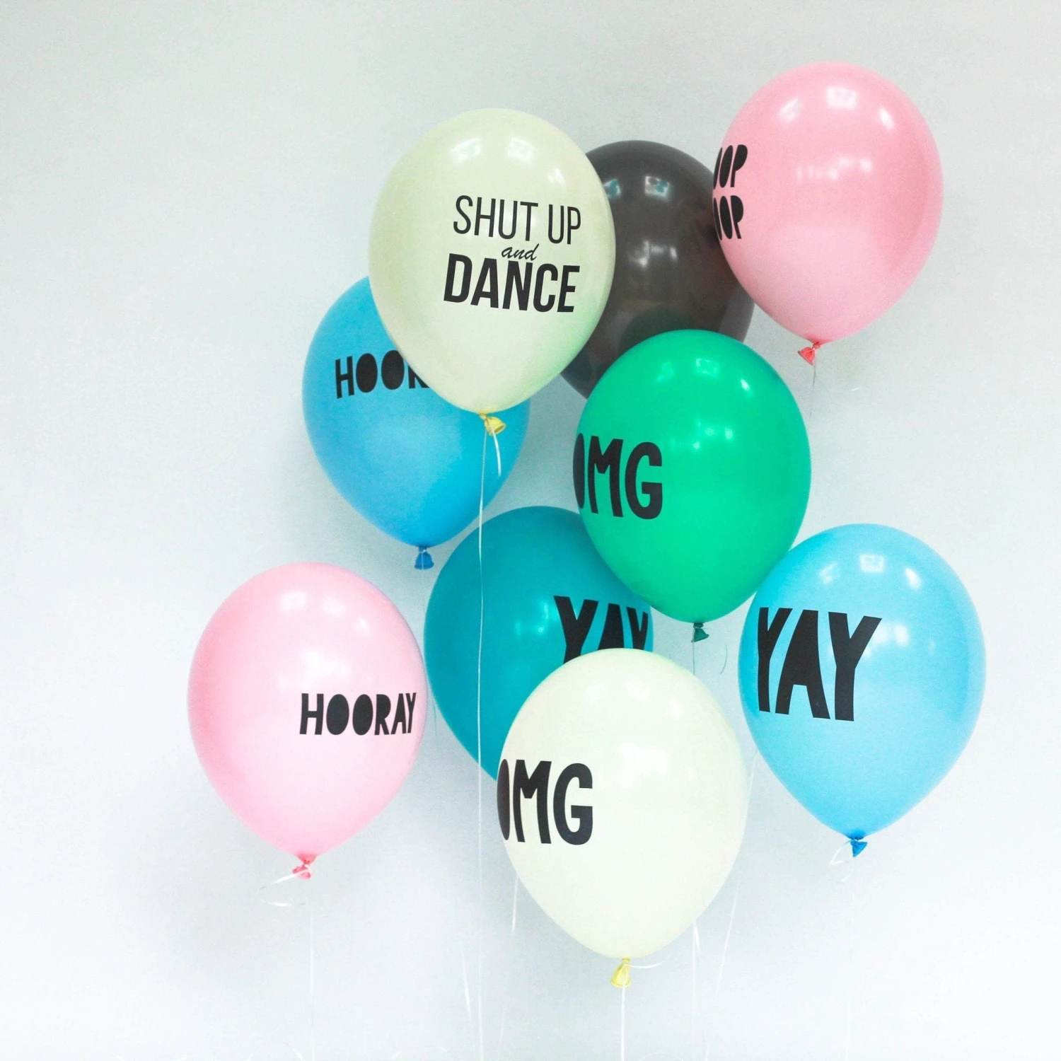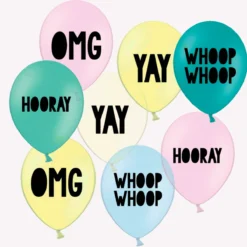 You will receive 10 balloons randomly picked from our range of Yay, Whoop Whoop and OMG from four colours – sky blue, teal, yellow and mint (Hooray and pInk, white and grey not available)