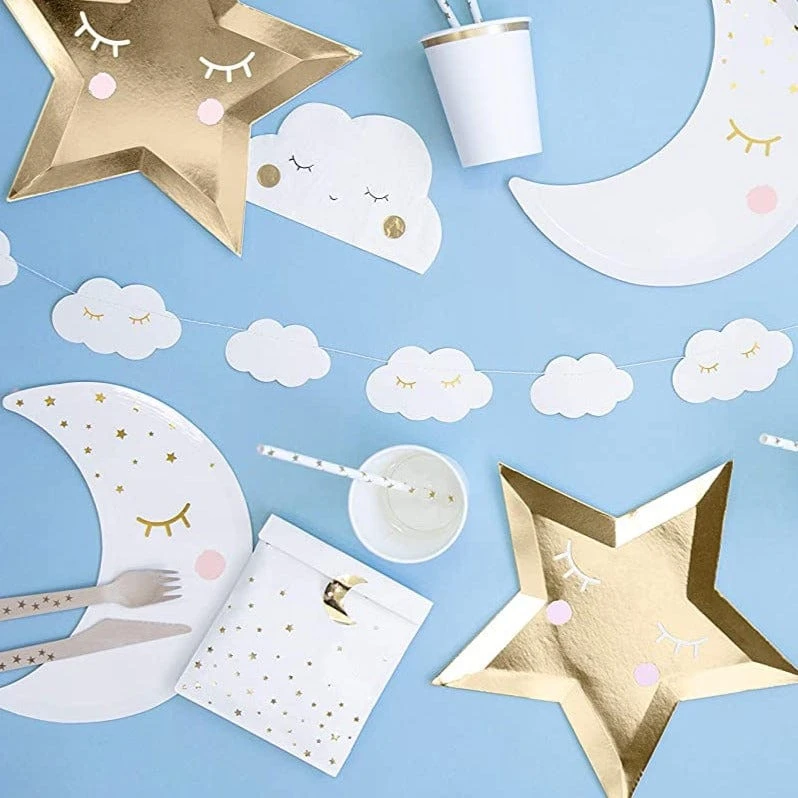 Sewn garland Little Star – Clouds made of white paper with gold print, length approx. 1.45 m, height approx. 5.5 cm.