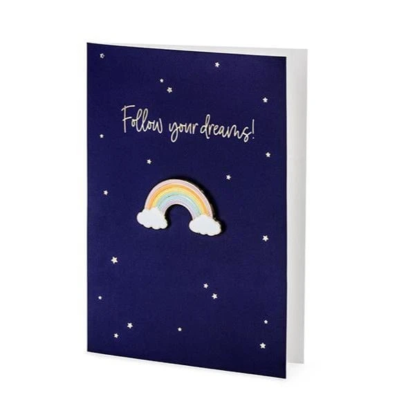 Follow your dreams! We love this cute card with its attached enamel pin featuring a rainbow withe clouds