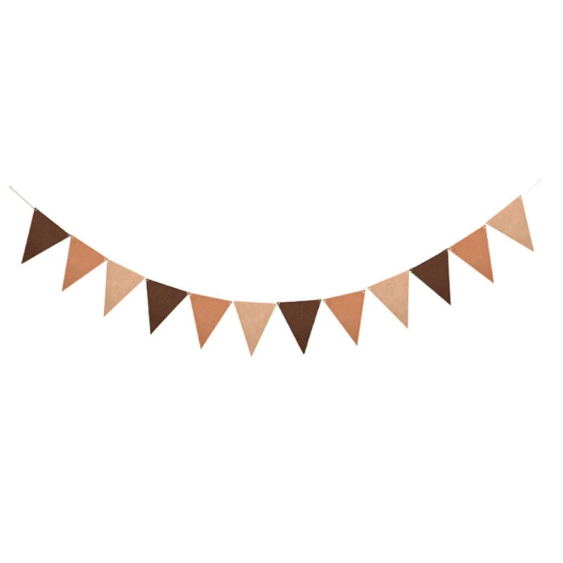 12 felt flags in Brown shades with 2.5m of white ribbon.
