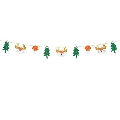 An adorable woodland garland featuring Deer, Trees and Toadstools. This beautiful garland with golden touches will add the finishing touch to your party decorations!Â