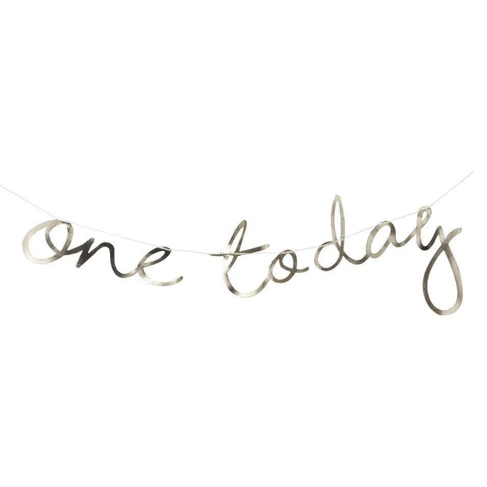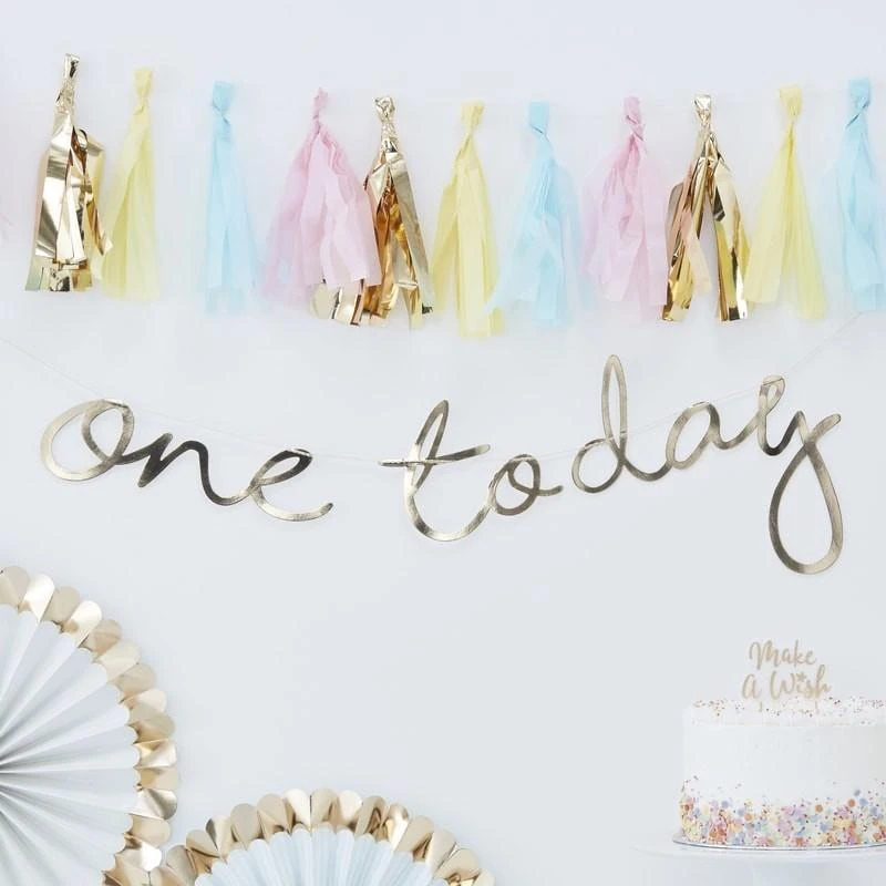 Use this stunning gold foiled First Birthday Bunting to celebrate being ‘One Today’. Make a 1st birthday party even more special by using this gorgeous scripted backdrop!