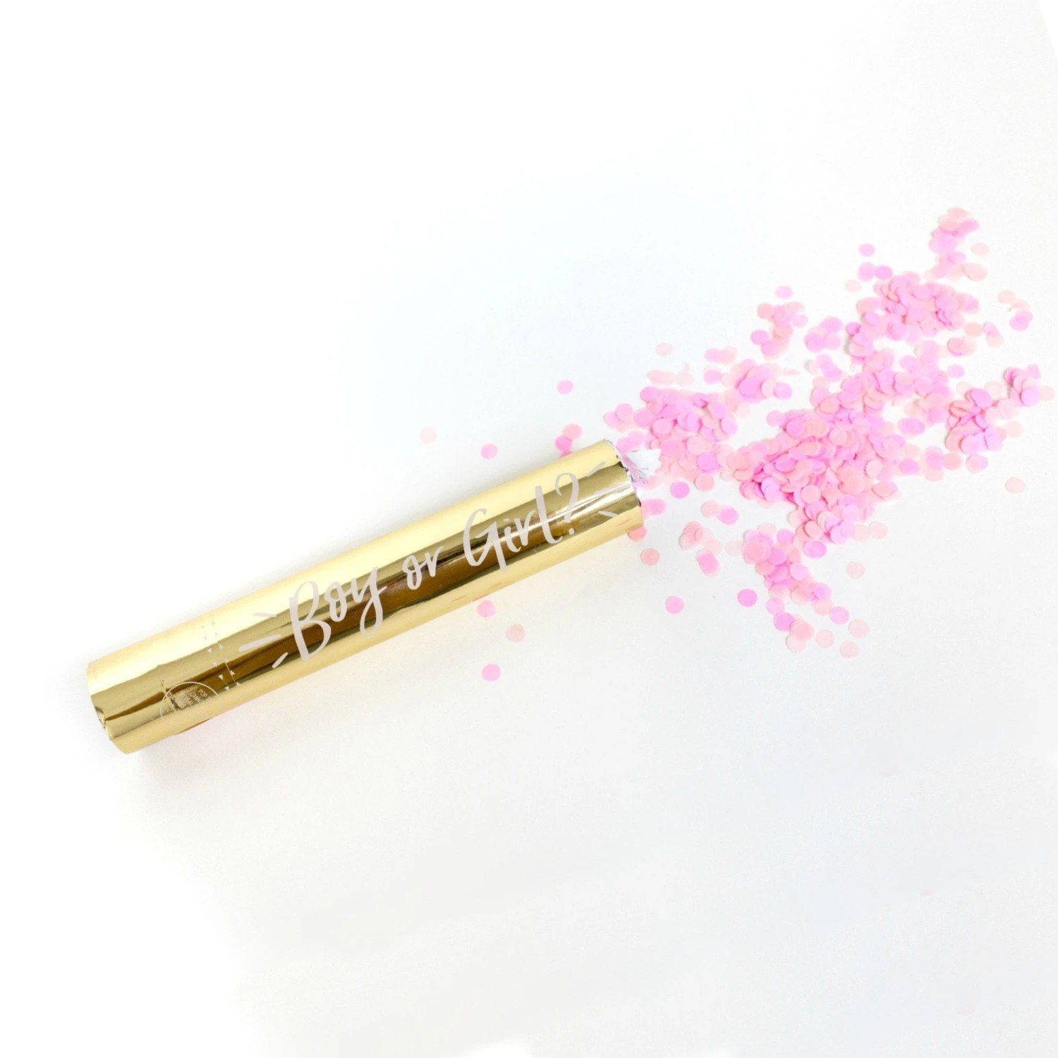 Family and friends will not know what colour confetti is going to cascade out of the cannon, revealing a confetti explosion. (Each cannon has a sticker on saying if it is for a boy or girl, this sticker can be removed)