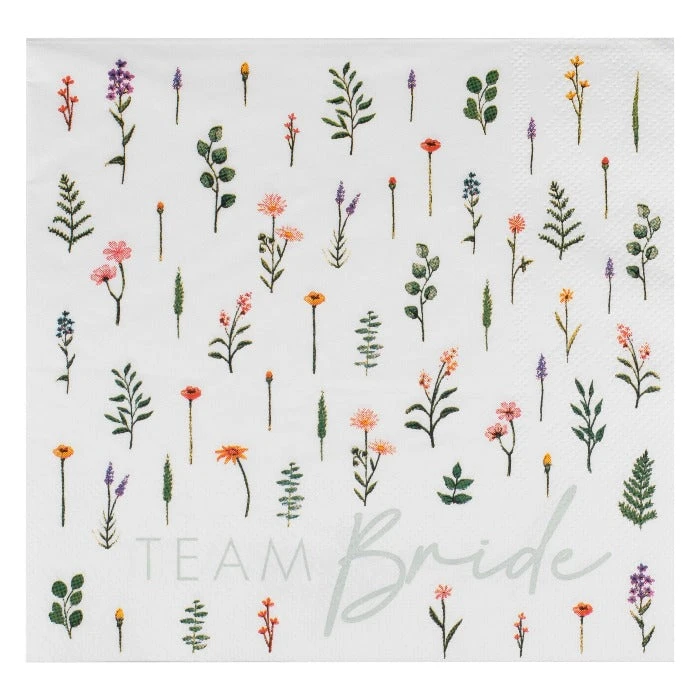 16 x Paper napkins with ‘Team Bride’ written on each one and a floral design printed