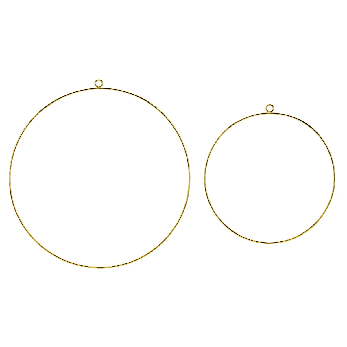 Made of wire in gold metallic colour, each set contains 2 hoops; diameter approx. 20cm and approx. 28cm.Â