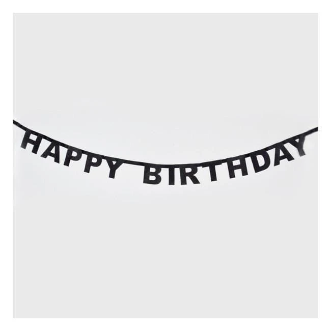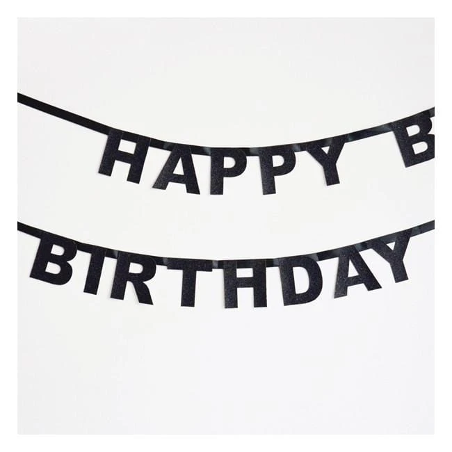 A string of glittery black paper letters which spells out “Happy Birthday”. The letters are 9cm and hang on a 1.85m length of ribbon.