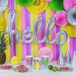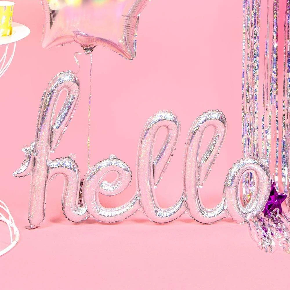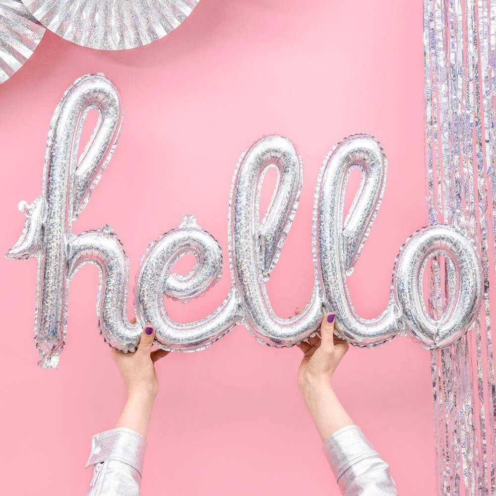 These cool silver holographic ‘Hello’ script balloons are great for happy occasions and weddings. It is air-fill only due to its shape, and can be strung up with a nylon line or ribbon to make a banner. nb you will need a hand pump or a straw to air-fill this balloon (not included).