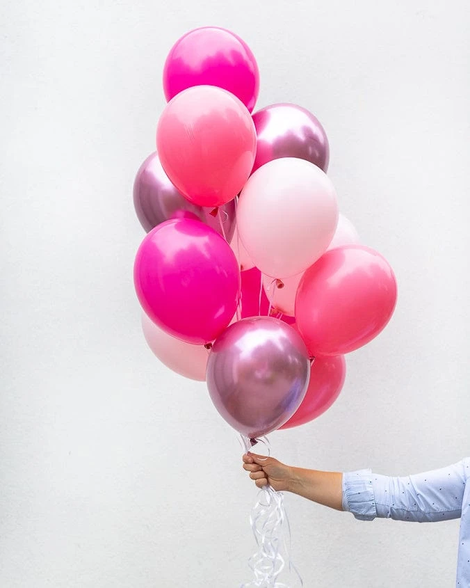 Create a pretty display at your party with this pretty mix of  balloons. Beautiful filled with puff or helium or use this mix to create a balloon garland, arch or cloud. The pack contains 3 balloons in 4 colours: Mirror Pink, Chalk Pastel Pink, Raspberry, Rose.