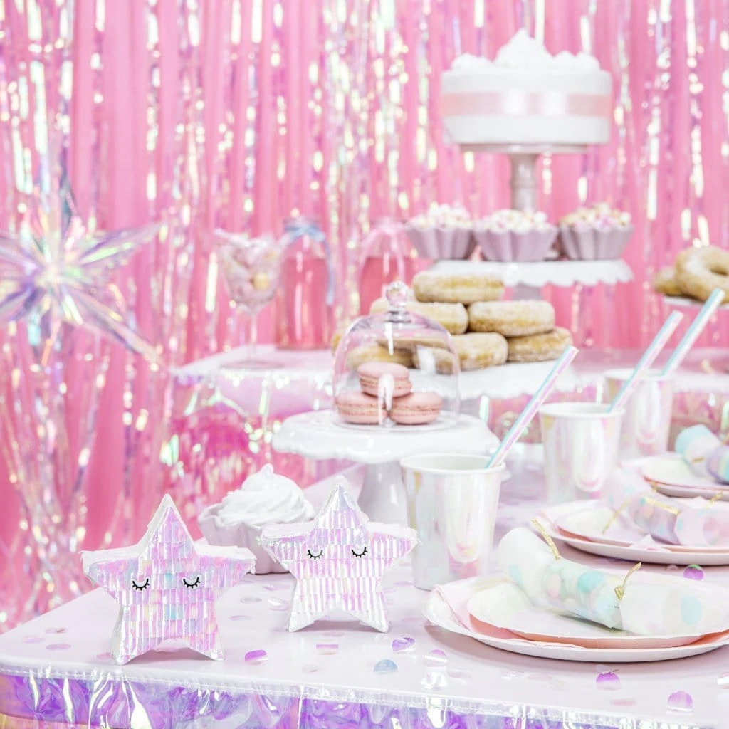 This shimmering iridescent door curtain can be hung as a backdrop, in a doorway or attached to a balloon to create balloon tails and tassels. (Attach to one balloon for a fuller effect or split the streamers between a few balloons to add sparkle and glamour to your occasion).