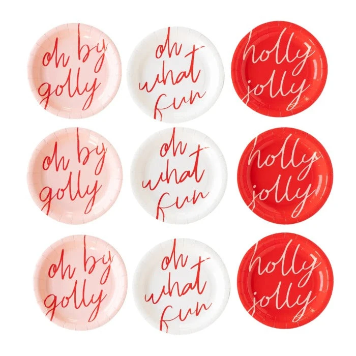 Looking for holly jolly party plates for your Christmas party? This paper plate set is perfect for your Holiday occasions. Featuring bright red, pink, and white plates with merry messages including: “Oh What Fun,” “Holly Jolly,” and “Oh By Golly,” these plates are the prefect as a side plate at Christmas dinner or for tasty Holiday treats and horderves at any festive gathering that you are planning.