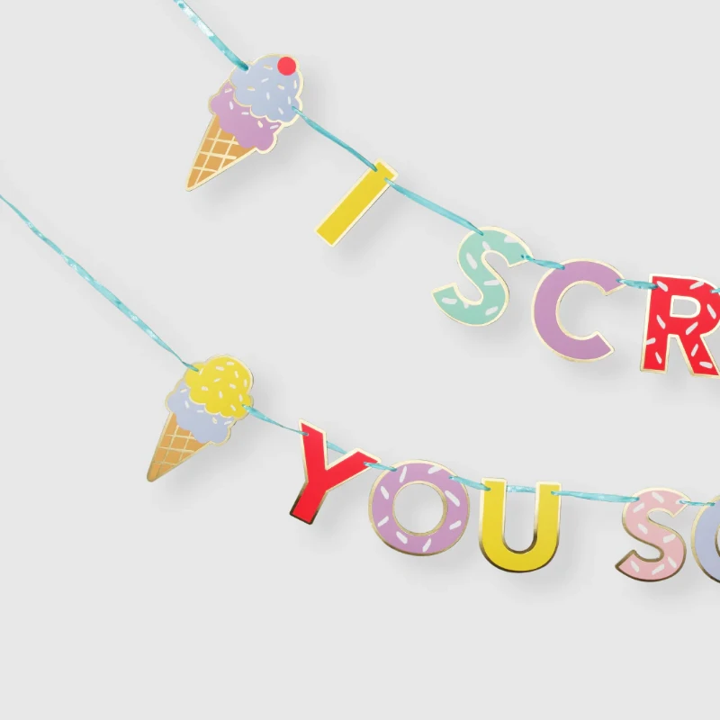 I scream, you scream, we all scream for ice cream! This fabulous ice cream party banner is aprox 9ft long with large pennants featuring ice cream colours and gold foiling.