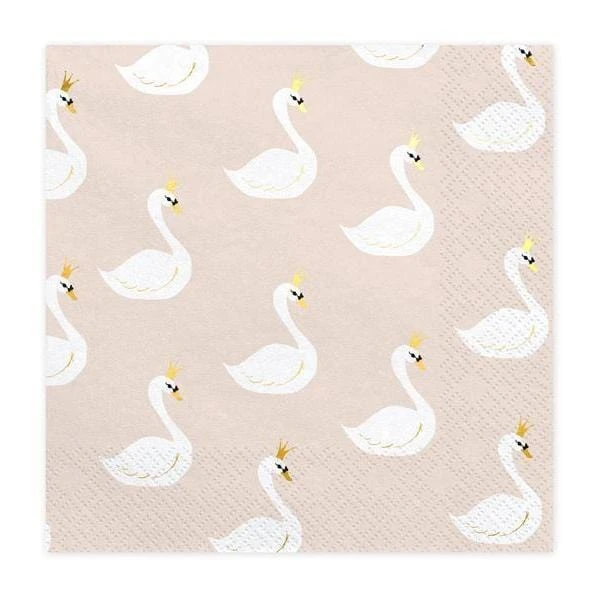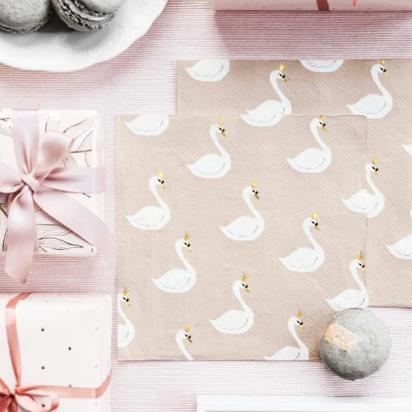 These pretty blush party napkins are covered in lovely swans, each one wearing a crown!