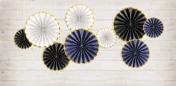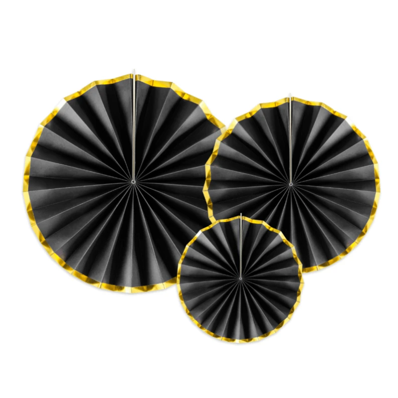 3 beautiful black paper fans with gold foiled edges. Simple and elegant, the perfect decoration for weddings and special events.
