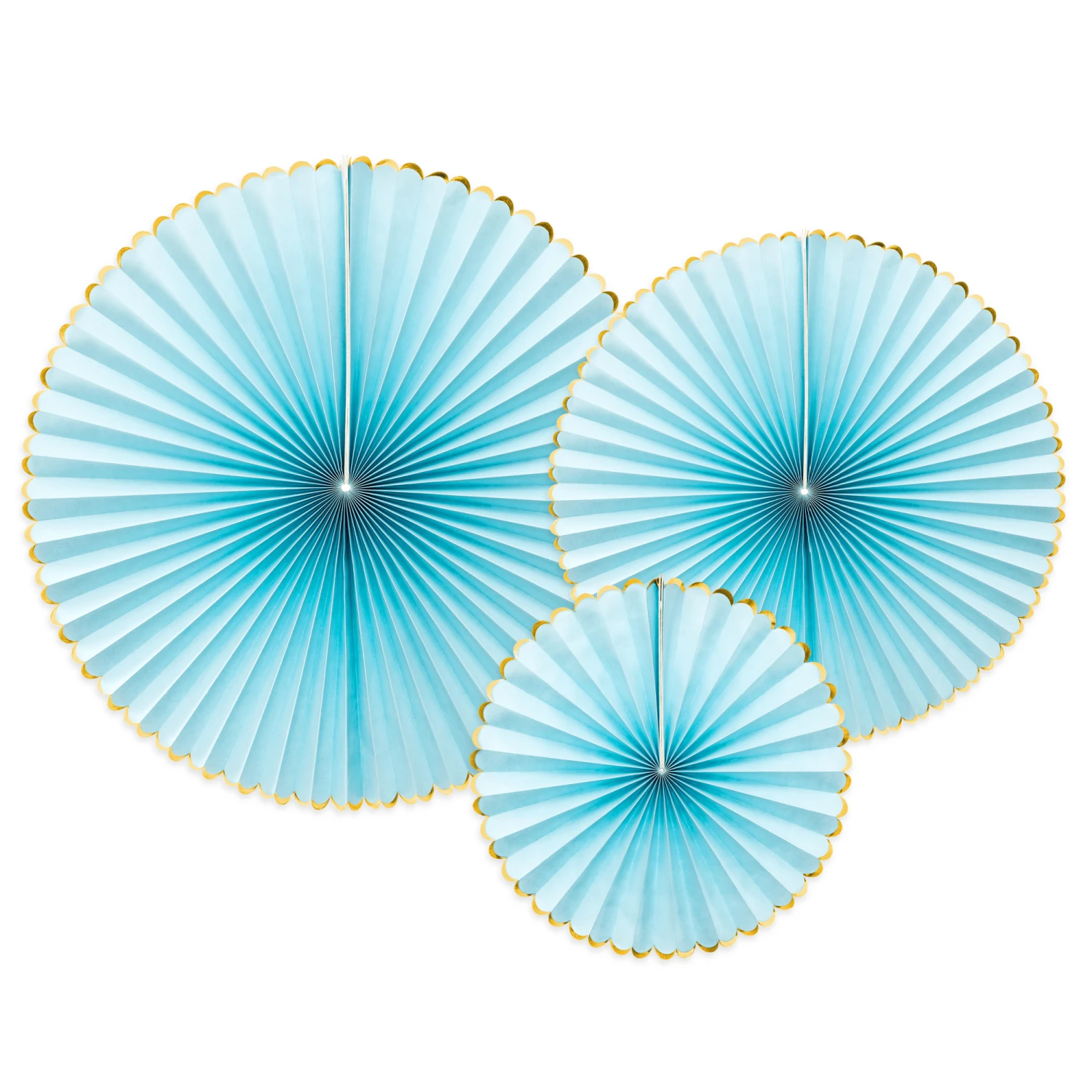 3 beautiful pale blue paper fans with gold foiled edges. Simple and elegant, the perfect decoration for weddings and special events.