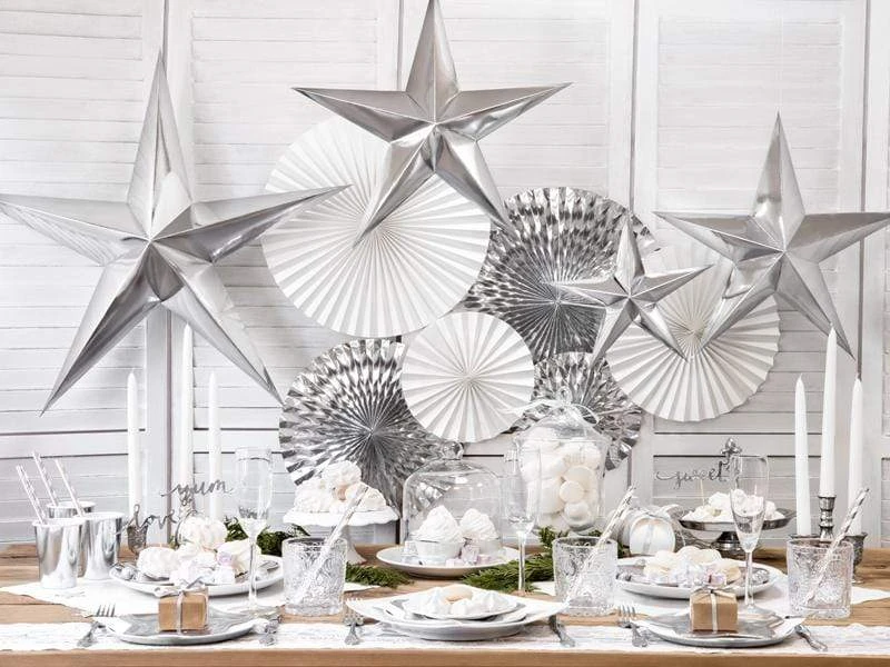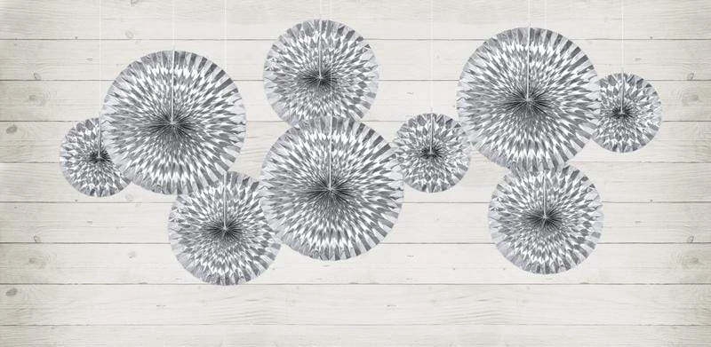3 beautiful silver foil party fans. Simple and elegant, the perfect decoration for weddings and special events.