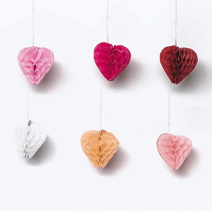 A pretty mix of mini heart honeycomb balls in the loveliest shades. attached is a cotton cord to hang but they are adorable scattered on the table or used as place settings or to embellish a gift. Perfect to celebrate valentines or a wedding or Anniversary.Â