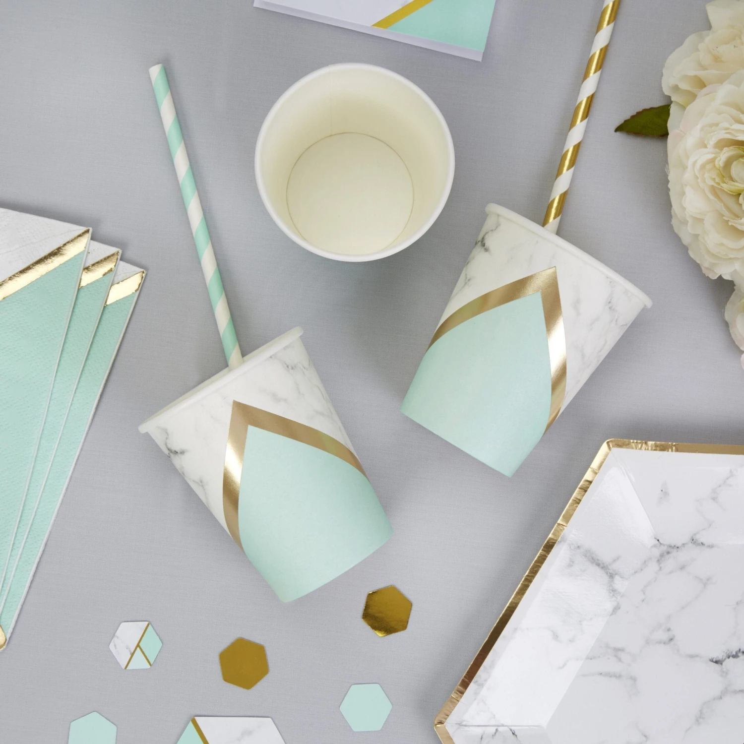 Your guests will swoon over this stylish tableware! These pretty cups feature a geometric and marble design with accents of mint and a gold foil finish. Perfect for girly gatherings, Weddings, Baby Showers and stylish parties.