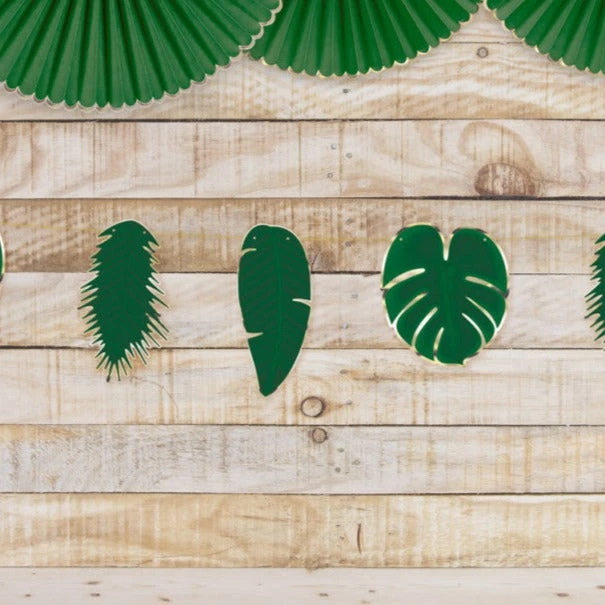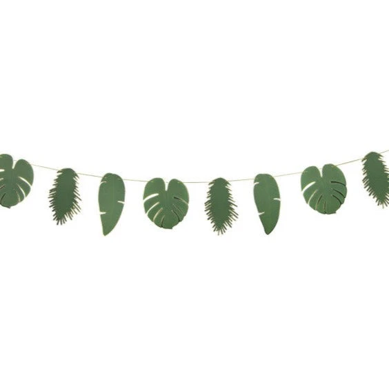 A gorgeous green garland featuring fifteen tropical gold edged leaves . Perfect for every tropical celebration!  Beautiful product with gold edged detailing and gold twine.