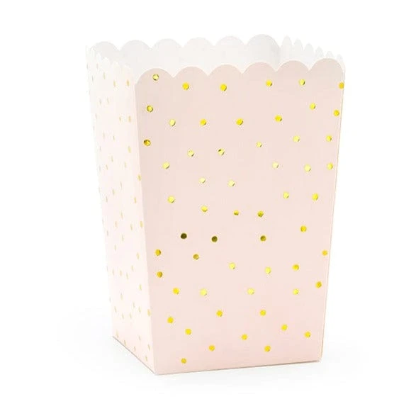 These pretty treat boxes are perfect for popcorn and sweet treats. Pale Pink and Gold Spotty boxes with a scalloped edge.