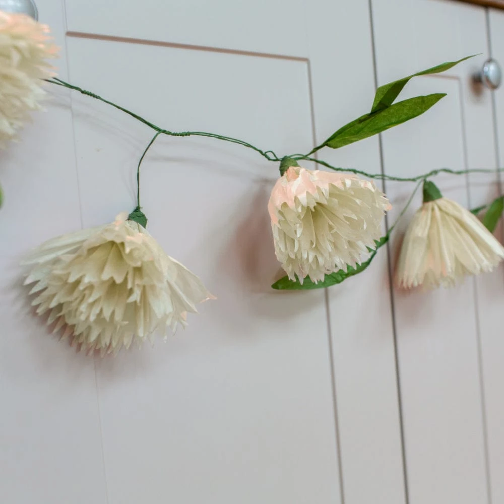 This pretty flower garland is made from handmade paper flowers. Perfect for parties but don’t just use it once as it makes the prettiest home decor too. Doors, tables or window sills can be decoratively decorated with the paper flower garland.Â