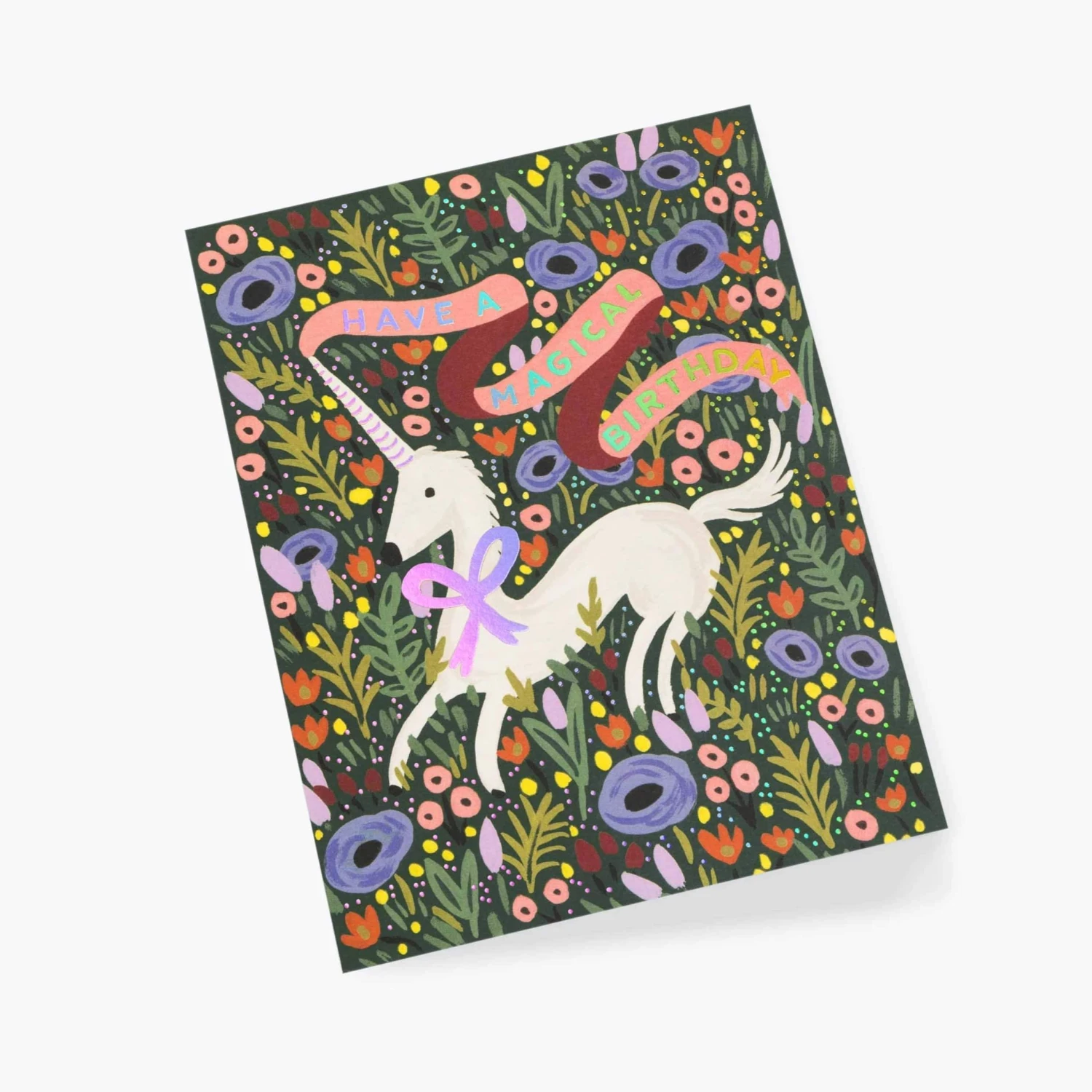 Rifle Paper Co Magical Unicorn card. Send a touch of magic with this adorable card. A blank interior lets your handwritten note take center stage.