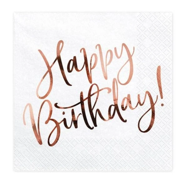 Simple and stylish white paper napkins with a rose gold ‘Happy Birthday’ print.