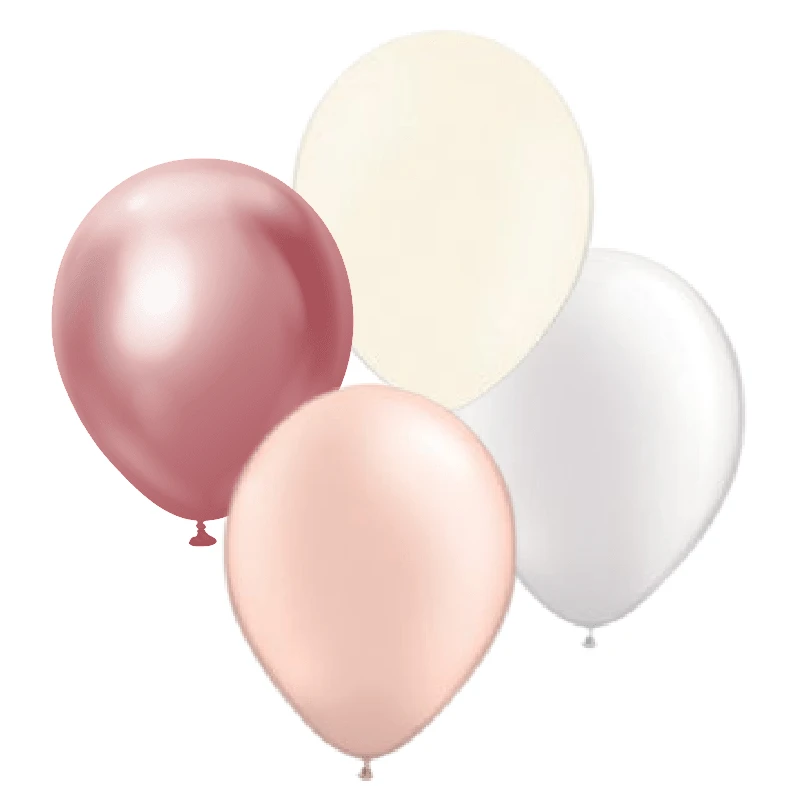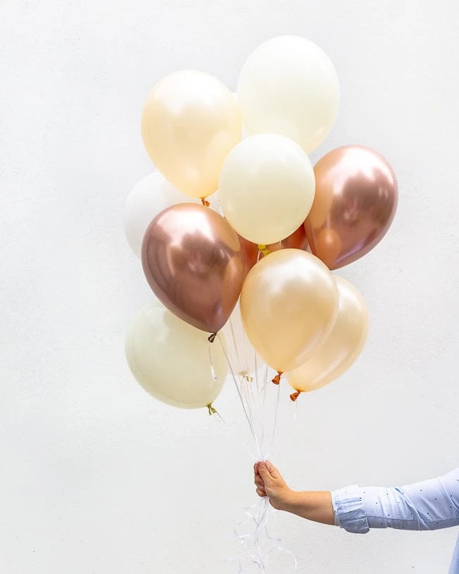 Create a gorgeous display at your party with these luxurious mix of balloons. This set of balloons has a pearly grown-up finish perfect for Weddings and stylish events. Beautiful filled with puff or helium or use the mix to create a balloon ceiling, balloon garland or arch. The pack contains 3 balloons in each colour: Mirror Rose Gold, Vanilla, White and Pearl Peach.
