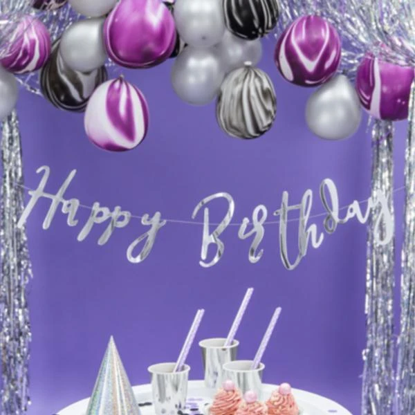 A birthday banner to make your special day sparkle! Happy Birthday banner made of shiny silver card.