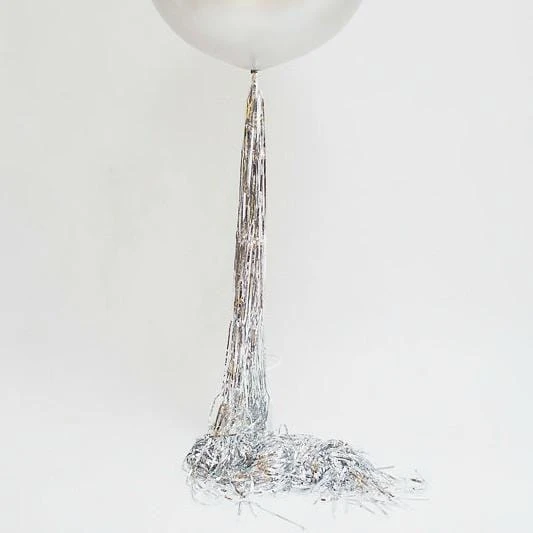 These are a party showstopper! These shimmering silver balloon tassels are a metallic door curtain that you can attach to a balloon with tape.