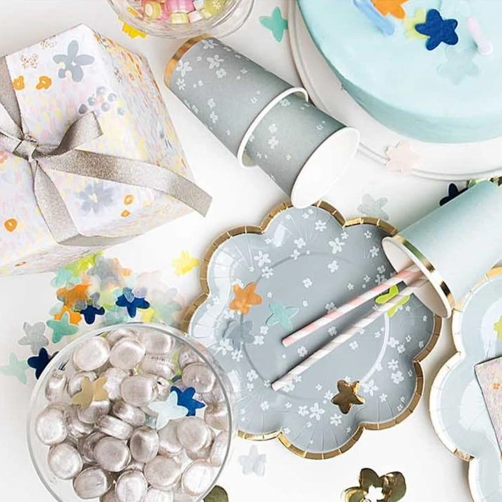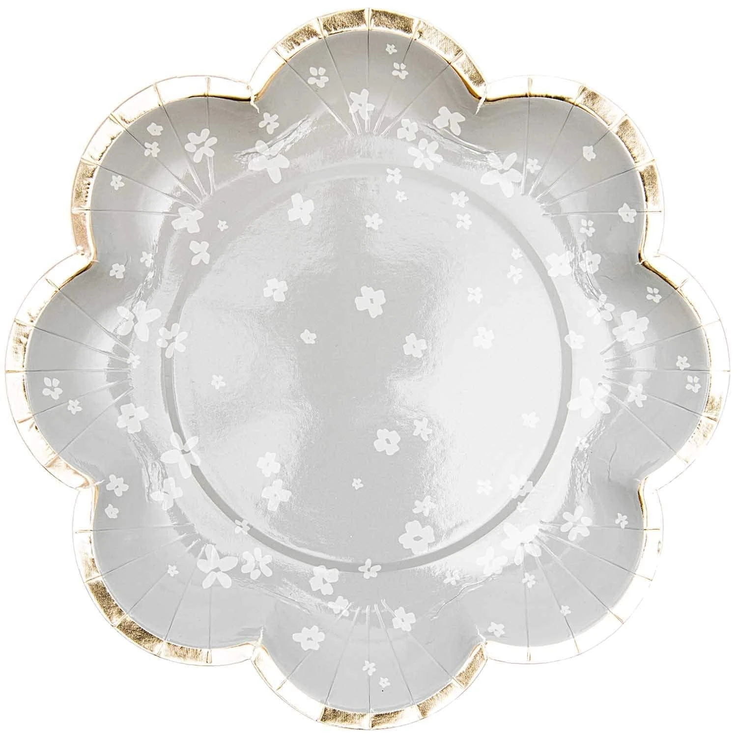 These small sized pretty grey flower shaped party plates are stylishly simple. The shape of a flower with a ditsy floral design and edged with gold foil for a touch of luxury.