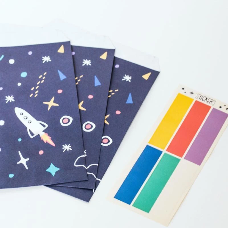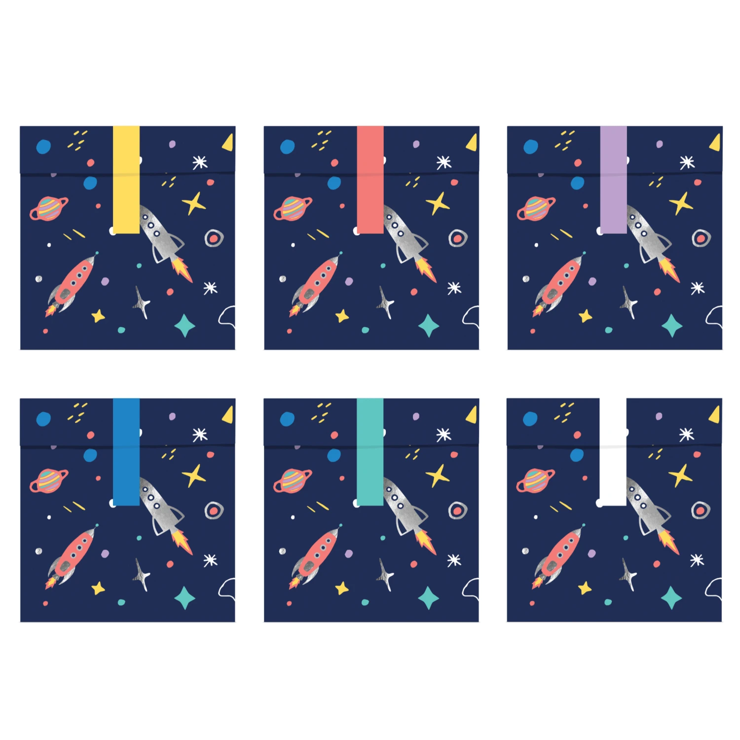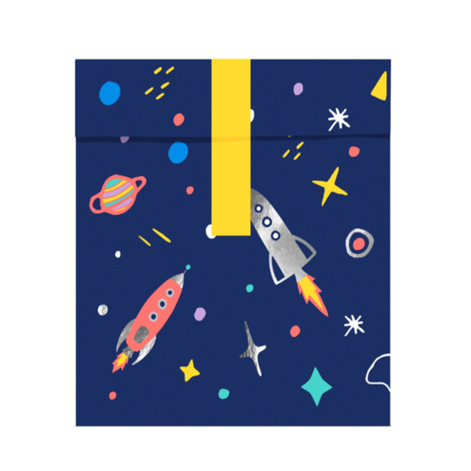 These space party treat bags come with colourful stickers for sealing. The bags feature space rockets, planets and stars and are embellished with shiny silver foil.