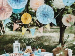 A sunny mix of six paper fans in pretty shades of lemon, peach and pale blue. Perfect to use as a backdrop for a special celebration. These beautiful quality rosettes are far too good to use for just one day, they can be closed and reused or alternatively they would look beautiful hung as permanent home decor.
