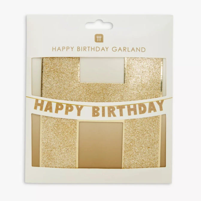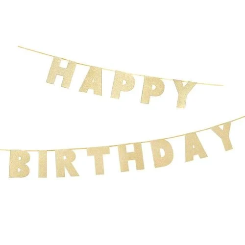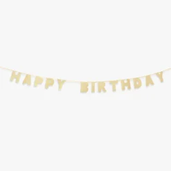 A string of glittery golden paper letters which spells out “Happy Birthday”. The letters are 18cm and hang on a 3m length of gold ribbon.