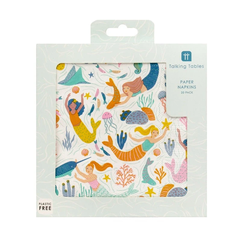 A colourful design of underwater creatures and mermaids is featured across these Make Waves Party Napkins.Â