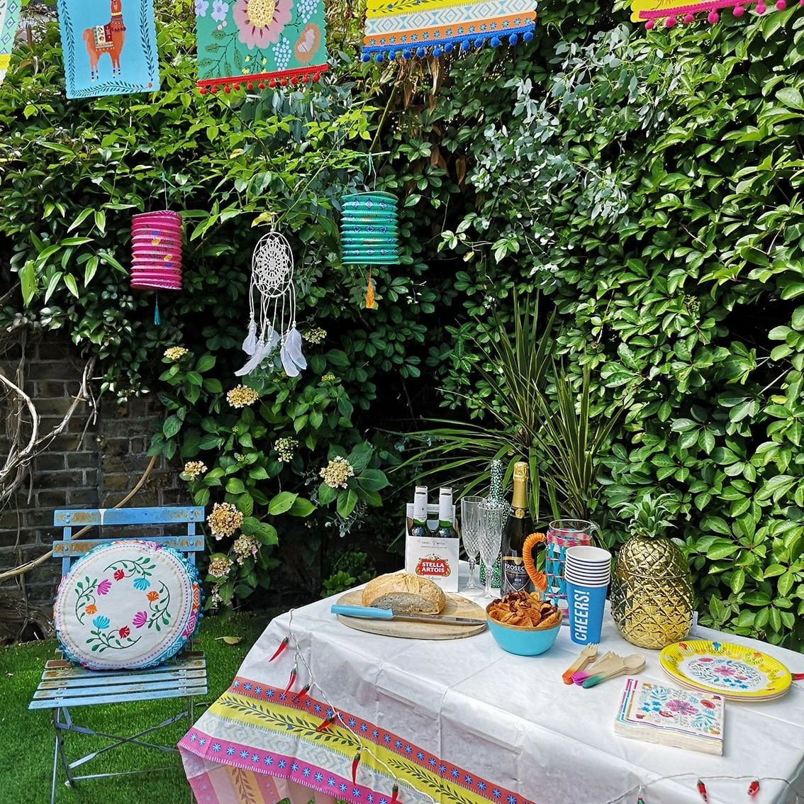 Disposable party table cover with brightly coloured boho design. A rectangular paper tablecloth for serving party food at boho birthday, garden party, picnic or summer BBQ. Pair with Boho party decorations and tableware.