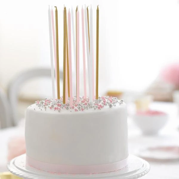 Tall cake candles in pink, gold and white. These tall candles are simply all you need to adorn your special birthday cake.