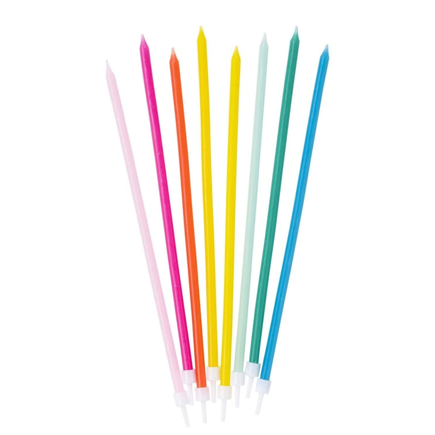 Light up the party with these tall rainbow candles! Each pack contains 16 tall thin candles in 7 different colours.