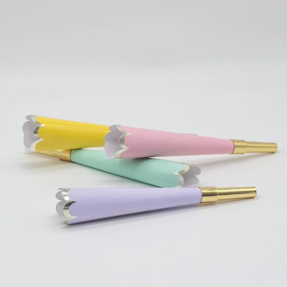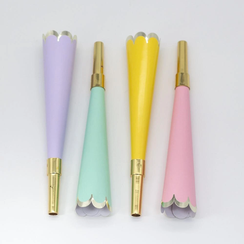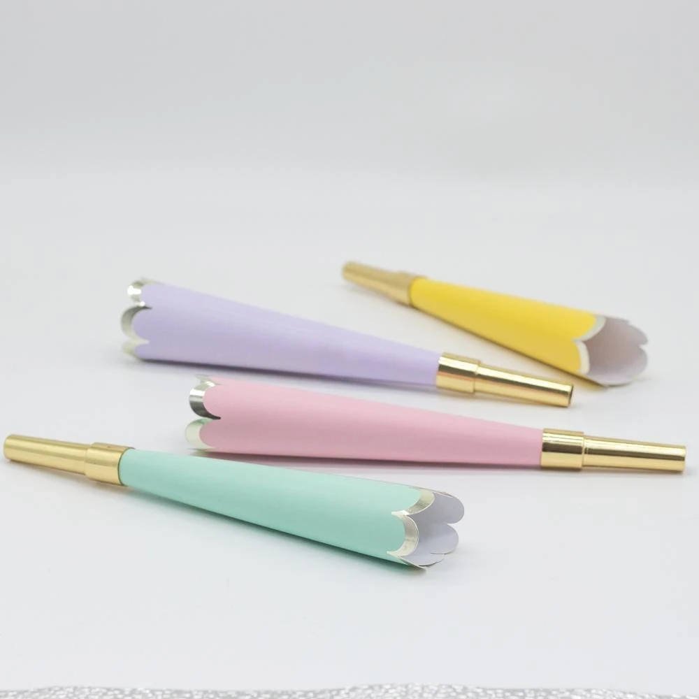 Make that party flair pretty with our Pastel and Gold Party Horn Noisemakers. Featuring shiny foil accents and a scalloped edge, these colorful party horns are ideal for celebrating a surprise birthday party or special occasion. Pass these paper horns out to guests when it’s time to sing Happy Birthday, or use them as props in a photo booth, alternatively pop them into party bags.
