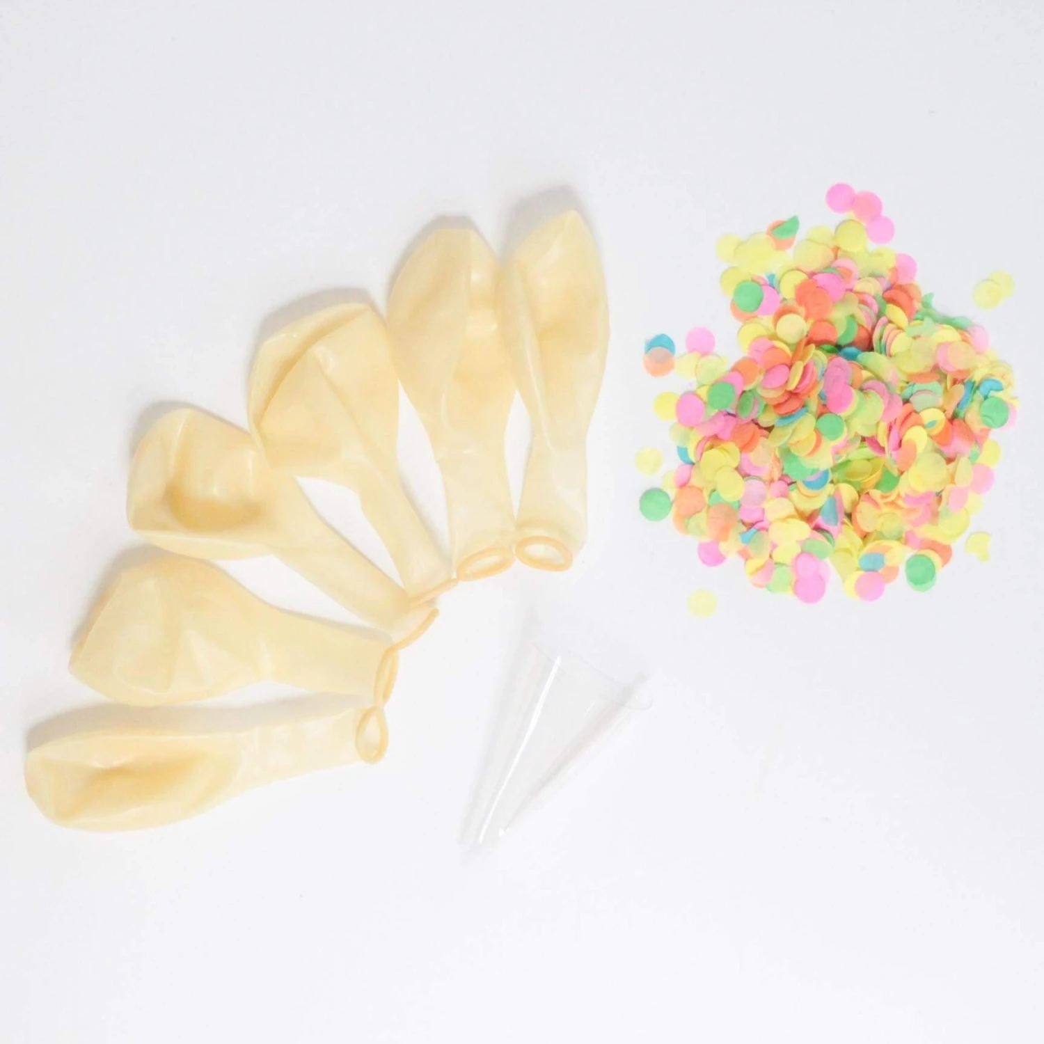 Confetti balloon kits come with everything you need to create your own confetti filled balloons. These balloons have a generous pack of pretty brightly colored circle confetti and come with full instructions of how to fill. Match with metallic ribbon and balloon weights for a gorgeous balloon bouquet. Fill with either helium or air.