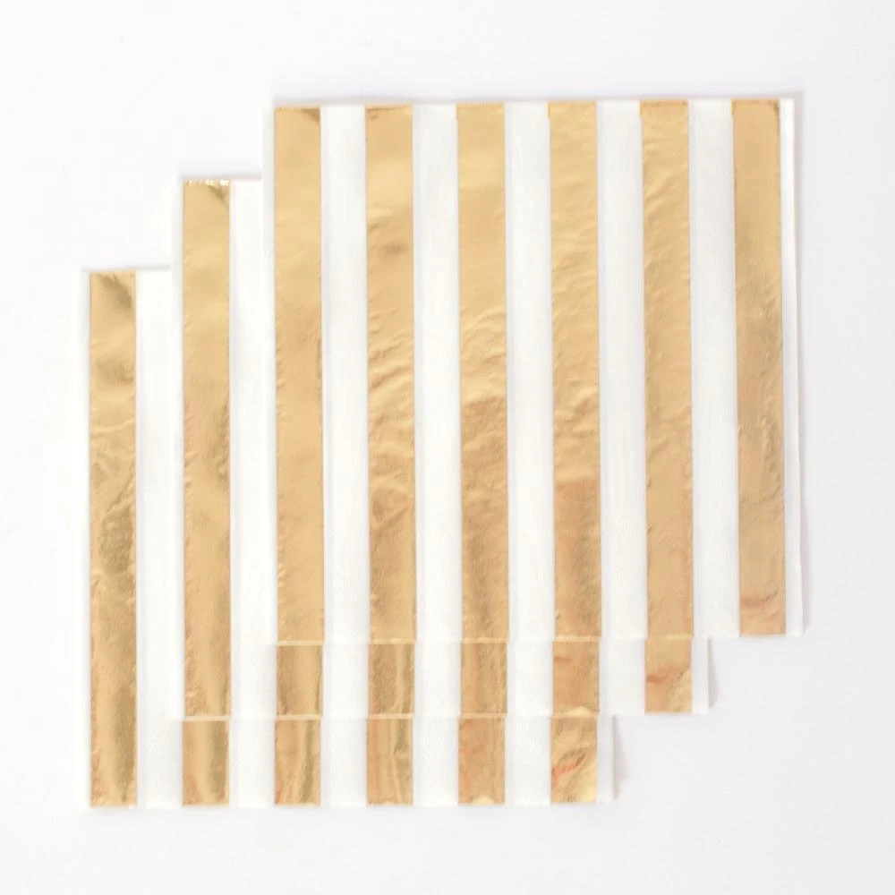 Stylish party napkins with shiny gold foil detail. Designed to be mixed and matched with other plates, cups and napkins to style your party beautifully. Shiny foil detail on one square and matt gold stripes on the other 3.